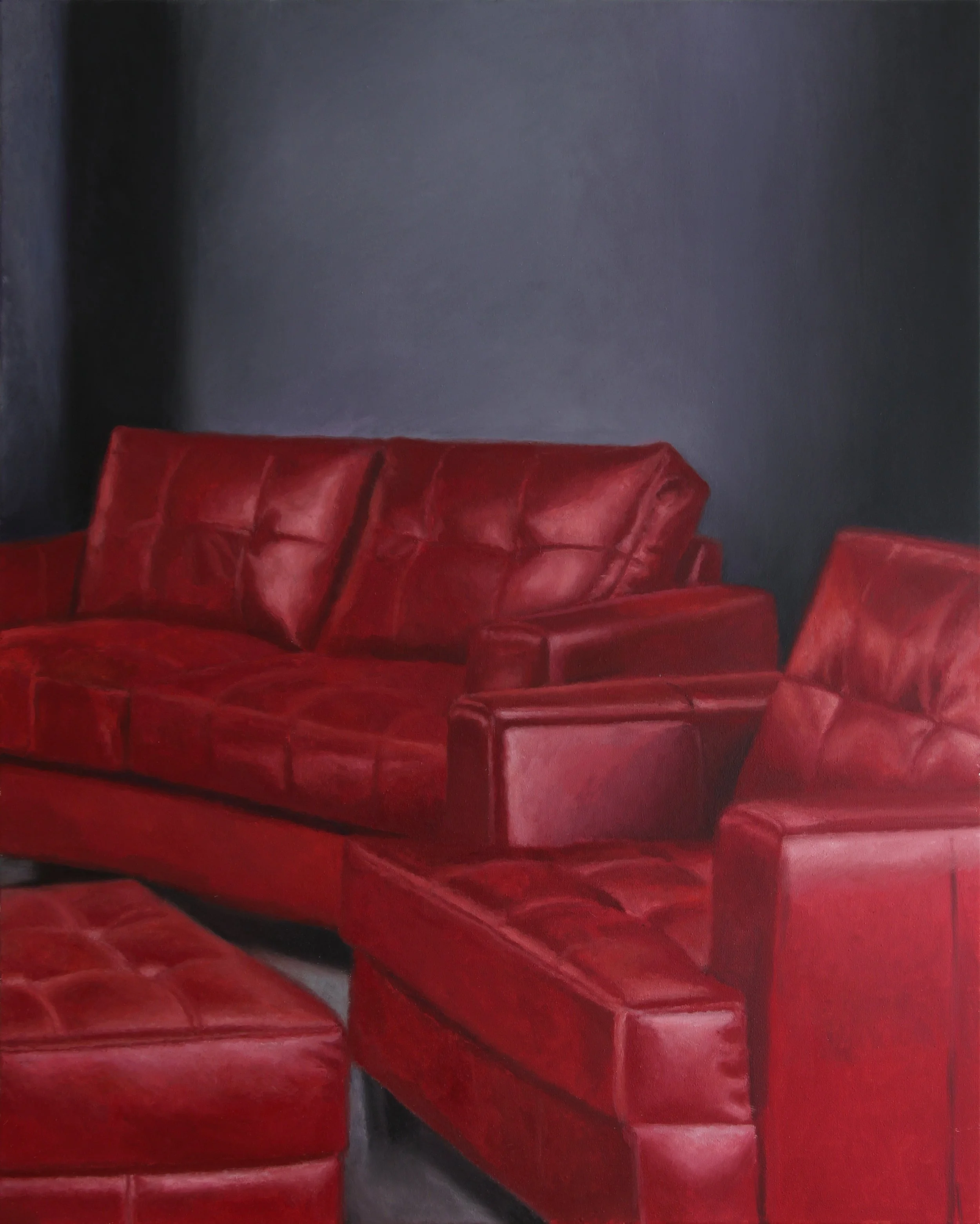 Leather Sofas, a more recent series, consist of 14 oil paintings on stretched canvas, also inspired by a lifestyle not too distant to that of the infamous street. The works are developed with initial sketches, then research begins across eBay, Walmart, and other e-commerce sites, and finally conceptualized within photoshop before the painting begins. The works inspire thoughts of North Italian clubs near the highway, the hardcore scene in the early 2000s, Lou Reed’s trousers, fake luxury, middle class living, sex, and leather subculture.